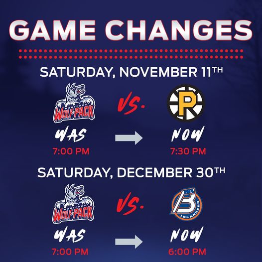 The Wolf Pack's home game on Saturday, November 11th, against the Providence Bruins will now be played at 7:30 p.m. The game was previously scheduled to have a 7:00 p.m. puck drop.