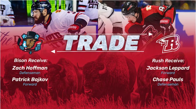 Bloomington, IL – Bloomington Bison General Manager and Head Coach Phillip Barski announced today the team has acquired forward Patrick Bajkov and Zack Hoffman from the Rapid City Rush for forward Jackson Leppard and defenseman Chase Pauls.