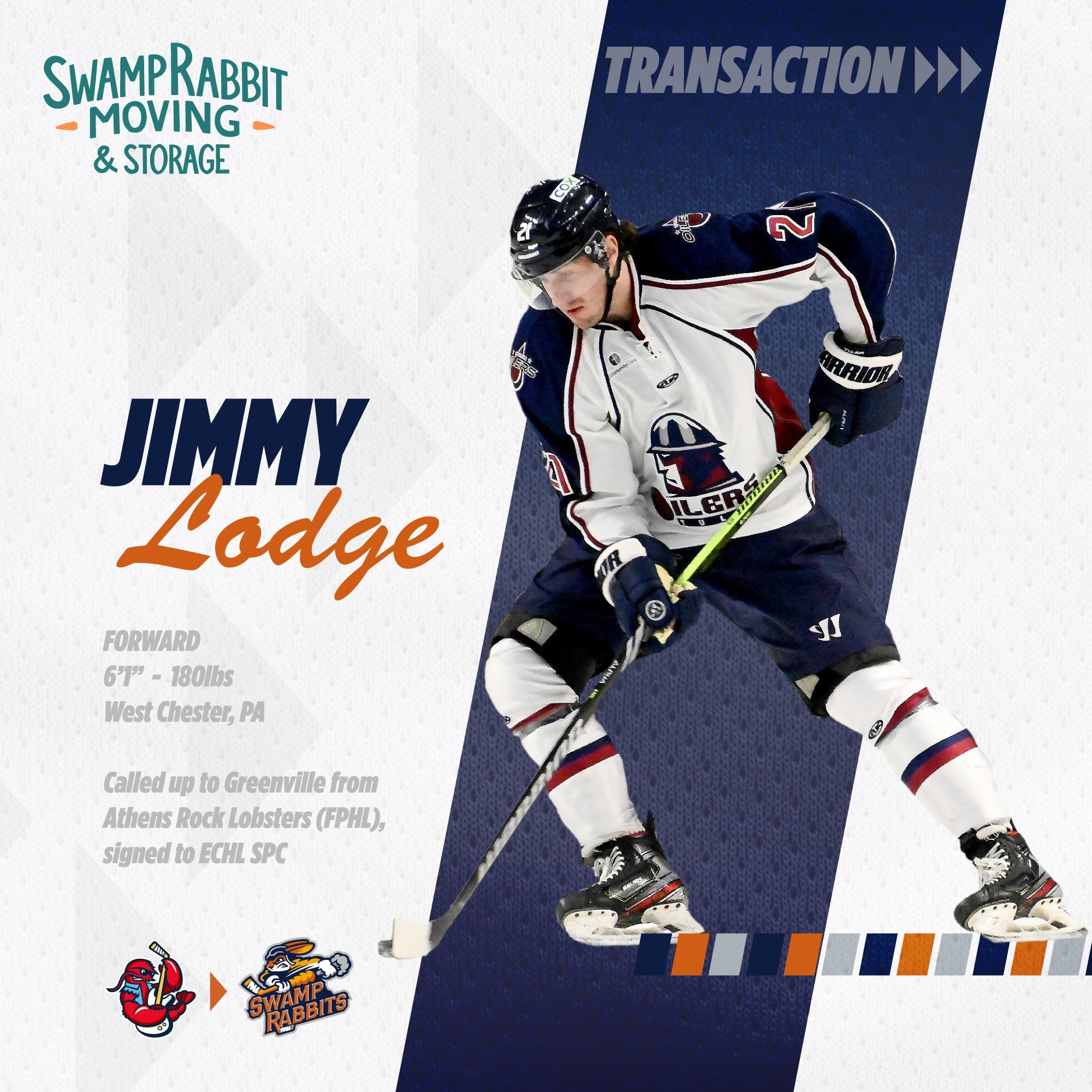 (GREENVILLE, S.C.) – The Greenville Swamp Rabbits, proud ECHL affiliate of the NHL’s Los Angeles Kings, announced today via a Swamp Rabbit Moving Transaction that the team has called up seventh year forward Jimmy Lodge from the FPHL’s Athens Rock Lobsters and signed him to an ECHL SPC ahead of tonight’s game against the South Carolina Stingrays. He will make his return to the Swamp Rabbits wearing #7, having previously played in the Upstate in the 2019-20 ECHL Season.