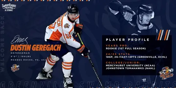 (GREENVILLE, S.C.) – The Greenville Swamp Rabbits, proud ECHL affiliate of the NHL’s Los Angeles Kings and AHL’s Ontario Reign, announced today via a Swamp Rabbit Moving Transaction that defenseman Dustin Geregach has signed with the team for the 2025-26 ECHL Season. He is the first player signing announced this offseason, and subsequently the first returning player from the 2024-25 campaign.