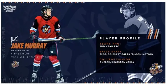 (GREENVILLE, S.C.) – The Greenville Swamp Rabbits, proud ECHL affiliate of the NHL’s Los Angeles Kings and AHL’s Ontario Reign, announced today via a Swamp Rabbit Moving Transaction that defenseman Jake Murray has signed with the team for the 2025-26 ECHL Season.