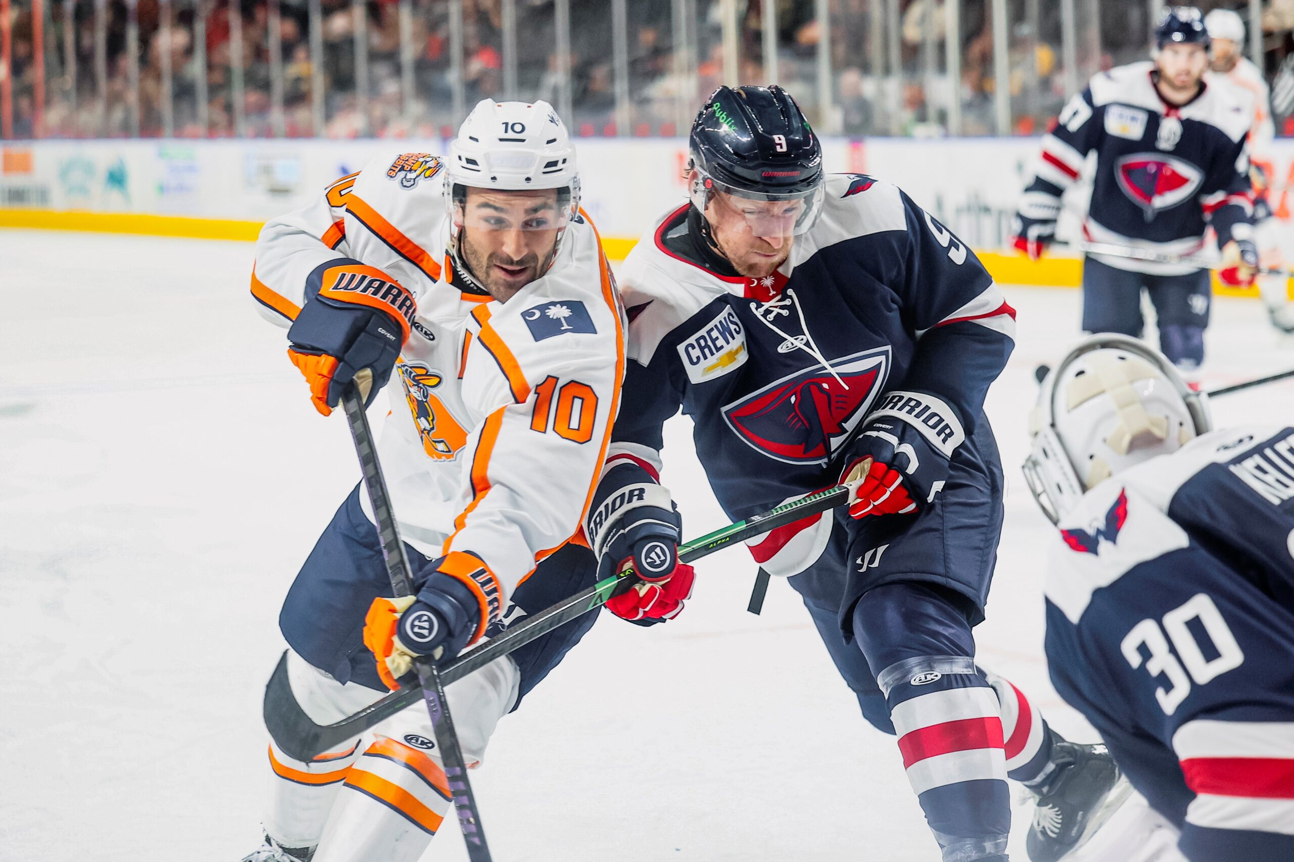 South Carolina took off with a three-goal second period, beginning with Stan Cooley’s first professional goal. With 3:28 played in the frame, Cooley deflected a Dean Loukus shot by Sholl, pushing the Stingrays ahead 2-1. Josh Wilkins then hit paydirt back-to-back around 10 minutes apart, starting with a tap-in of a rebound from a Simon Pinard drive at 7:21 of the period to make it 3-1. He then followed up with his second when Pinard found him on the left side from behind the net, finishing with a bullet past a sprawled out Sholl to increase the lead to 4-1 with 2:22 remaining in the frame.